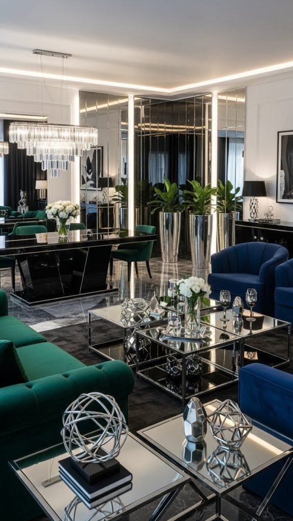 Use plush sofas, cushioned chairs, and layered rugs to create cozy seating areas. Soft furnishings balance glossy surfaces and sharp shapes.