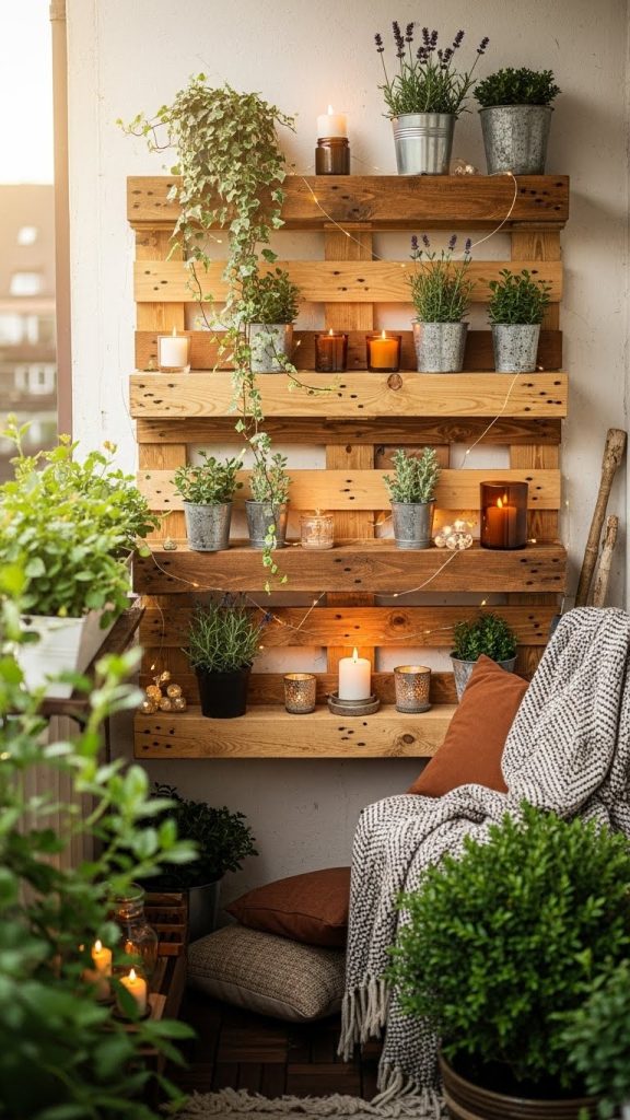 Wooden pallets can be repurposed into beautiful balcony wall decor. They provide a rustic and natural look, and you can use them to display plants, candles, or small decorative items. For this project, you will need a wooden pallet, sandpaper, paint or wood stain, hooks or brackets, and decorative elements. Begin by sanding the pallet to smooth rough edges and applying a paint or stain to enhance its appearance. Securely attach the pallet to the wall using strong brackets or screws. You can leave the pallet empty for a minimalist look or attach small pots, fairy lights, or shelves to hold decorations. Wooden pallets are sturdy and versatile, allowing you to customize the display according to seasons or moods. They also offer the opportunity to incorporate small storage options, keeping the balcony organized. This DIY project is cost-effective and sustainable since it reuses materials. A pallet wall can become a functional and attractive feature, giving your balcony a cozy, rustic charm while showcasing your creativity.