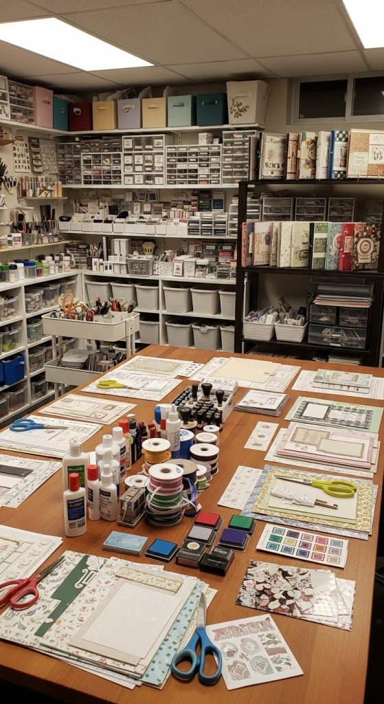 Materials include cardstock, patterned paper, glue sticks, scissors, cutting tools, stamps, inks, and ribbons. Use vertical storage, drawers, or bins to separate supplies by color, type, or project. Consider a rolling cart for frequently used tools, making them easily accessible without cluttering your main work area.