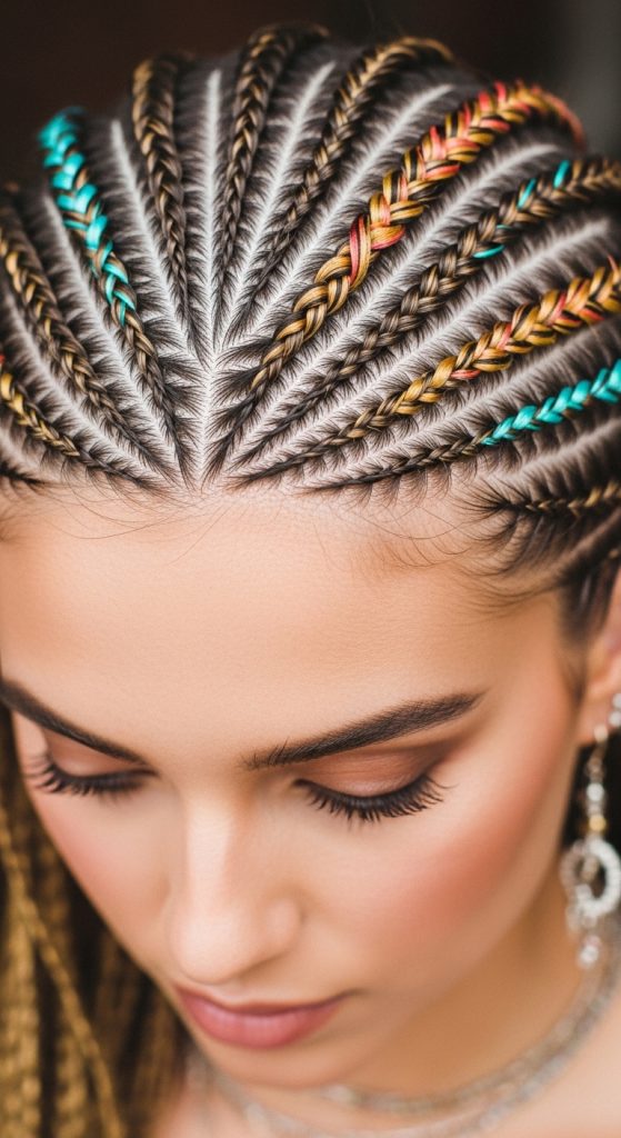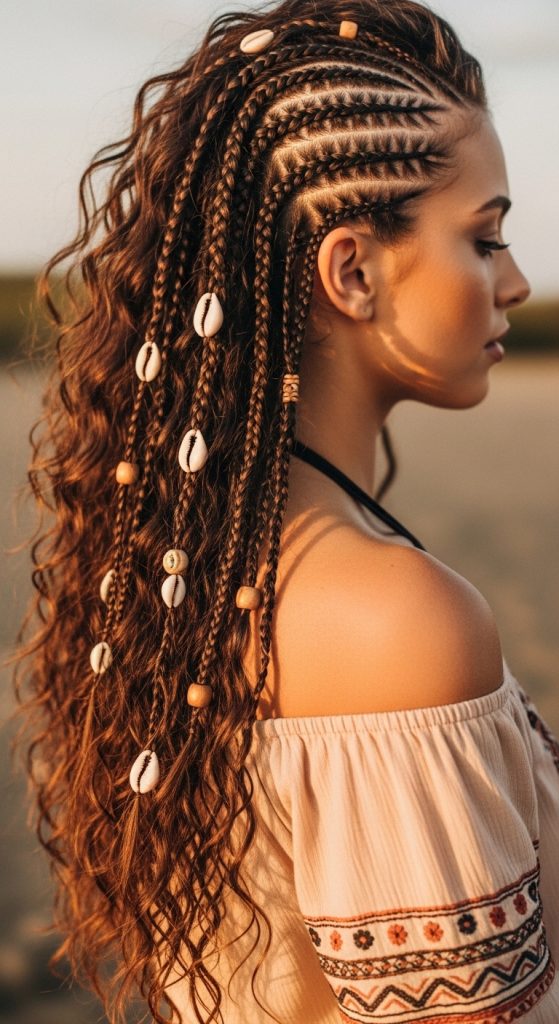 Once you complete each cornrow, add beads or shells at the ends of the braids to enhance the boho vibe. Wooden beads, metallic accents, or natural shells work best for an earthy aesthetic. This style can be worn with your hair down or pulled back into a half-up hairstyle for versatility.