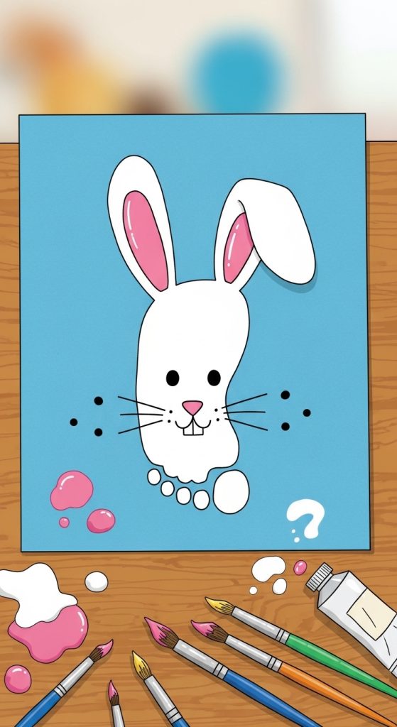 Paint the toddlerโs foot with white paint and press it onto the paper with toes pointing upward. The footprint creates the bunnyโs body. Use pink paint for inner ears and draw eyes, whiskers, and a nose with markers.