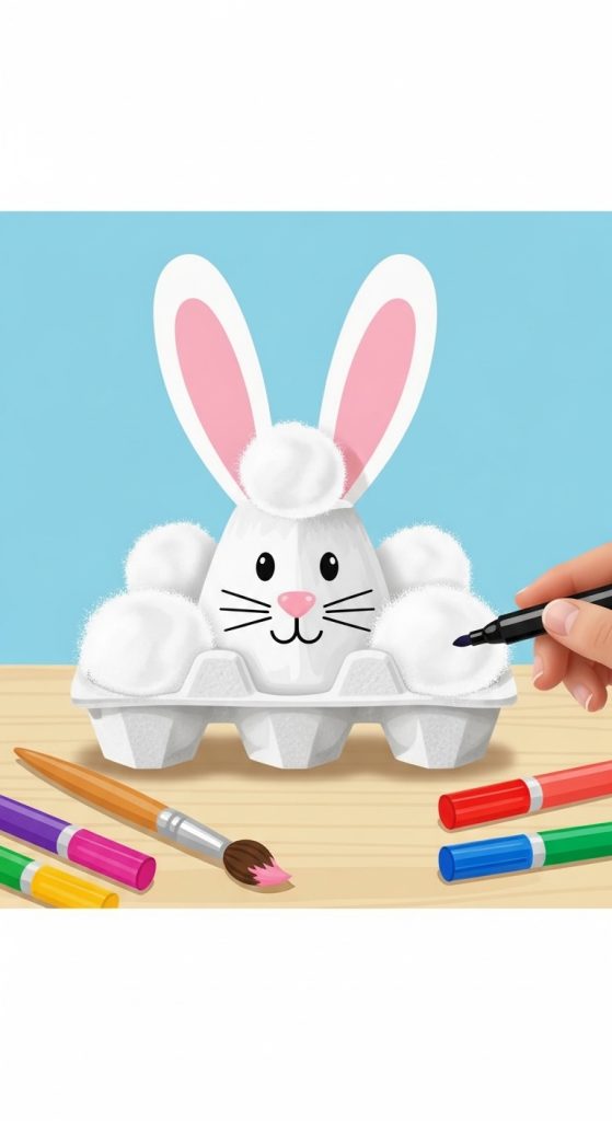 Cut an egg carton section to form the bunnyโs head. Paint it white and let it dry. Glue cotton balls to make the bunny fluffy. Add paper ears, eyes, nose, and whiskers using markers.