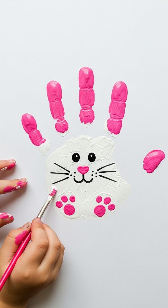 Start by painting the toddlerโs hand with white paint. Press the hand onto the paper so the fingers point upward. The handprint becomes the bunnyโs body, with the thumb forming the head. Use pink paint to create inner ears or a small nose. Once dry, draw eyes, whiskers, and a smiling mouth with a black marker.