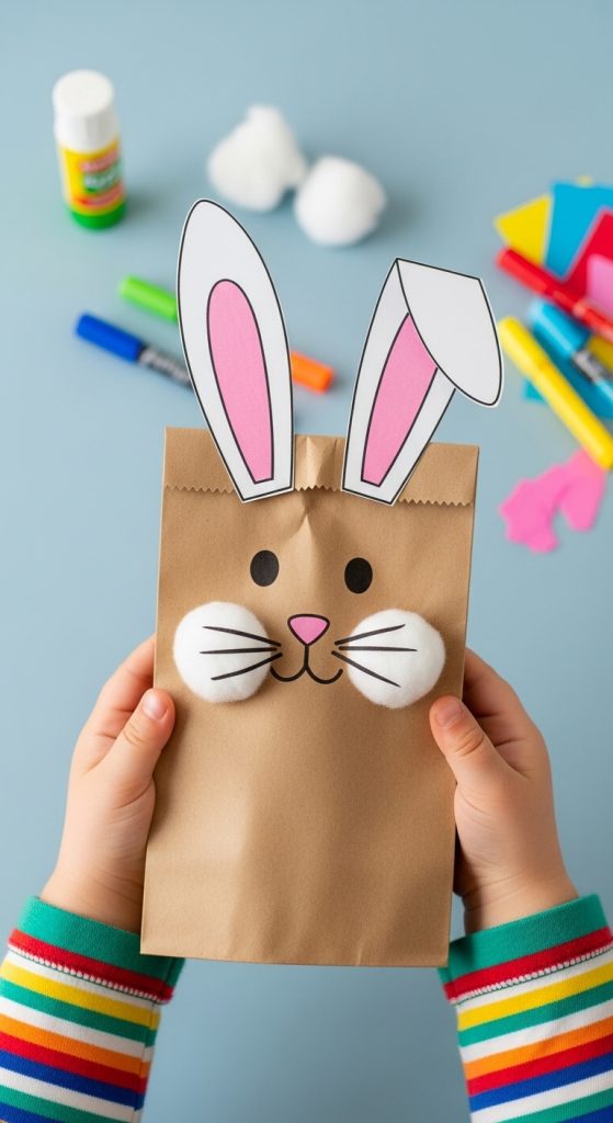 Flip the paper bag so the bottom becomes the bunnyโs face. Glue cotton balls on the flap for cheeks and nose. Cut ears from white and pink paper, and attach to the top of the bag. Use markers to draw eyes, mouth, and whiskers.
