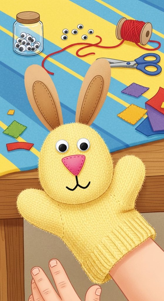 Insert cotton stuffing into the sock to form a soft bunny shape. Glue felt pieces for ears and a nose. Add googly eyes or draw them on. The open end of the sock can be used to make the puppet move, turning the bunny into a fun interactive toy.