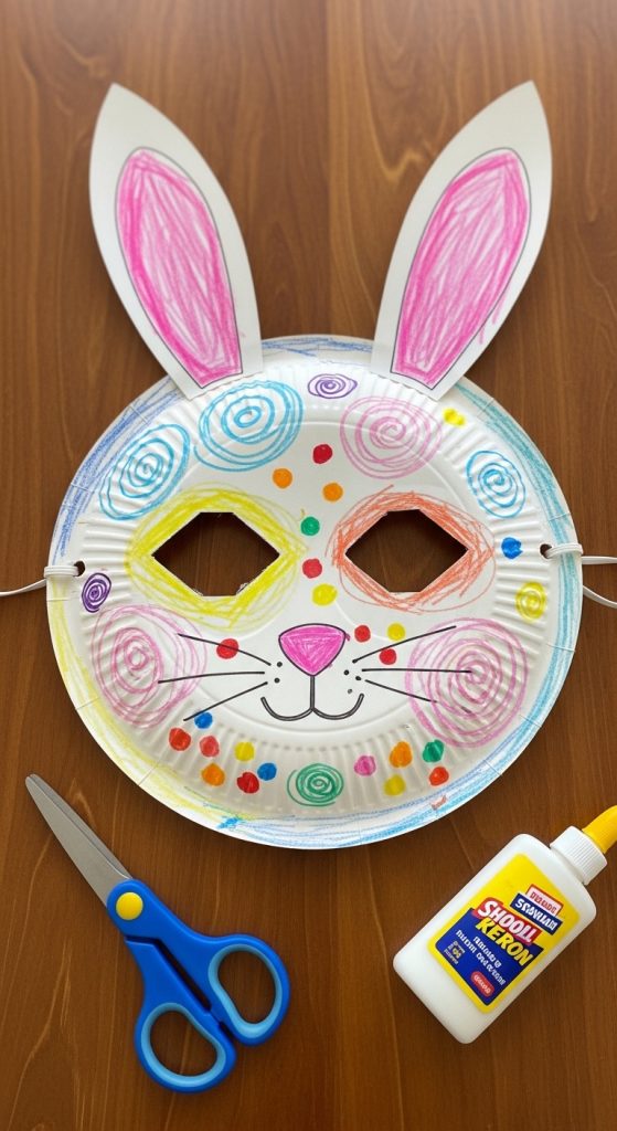 Cut the paper plate to fit over the toddlerโs face. Cut eye holes and decorate the plate with coloring materials. Attach ears using pink and white paper. Add whiskers and a nose using markers. Tie an elastic string at the sides to hold the mask in place.