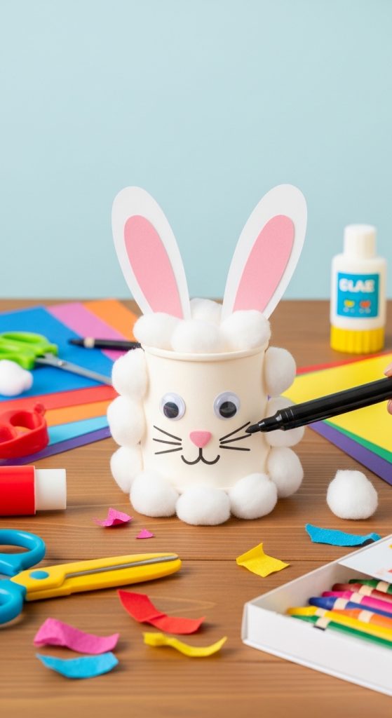 Take a small paper cup as the bunnyโs body. Glue cotton balls around the outside to make it fluffy. Cut ear shapes from white and pink paper, then glue them to the cupโs top. Attach googly eyes and draw a small nose and mouth with a black marker.