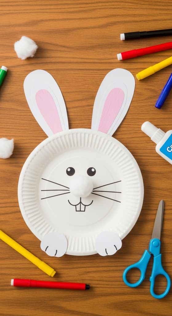 Tips: Make the ears sturdier by folding a small edge behind the paper plate to create a stand-up effect. For variety, let toddlers decorate the bunny face with stickers or colored markers.