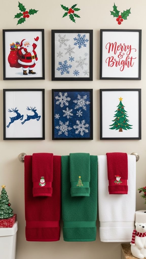 Decorating the walls with Christmas art transforms plain bathroom walls into festive statements. Preparation requires measuring wall spaces and choosing waterproof or humidity-resistant artwork suitable for bathroom conditions. Materials include framed prints, canvas paintings, vinyl decals, or adhesive stickers with holiday designs.