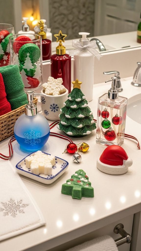 Use involves placing candles on counters, shelves, or near the bathtub. LED candles are ideal for safety, especially in bathrooms with high humidity. Combining scents with decorative holders shaped like Christmas trees, stars, or ornaments enhances the festive atmosphere. Layered candles of varying heights create visual interest and a cozy ambiance. This approach engages multiple senses, making the bathroom not only visually festive but also inviting with seasonal aromas. Candles are a classic decor element that seamlessly integrates with other accessories for a complete Christmas experience.