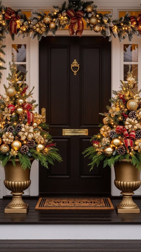 Fill the planters with evergreen arrangements and incorporate gold elements such as ribbons, glittered baubles, or small gold stars. Vary the height and size of arrangements to create visual interest. Adding lights ensures the arrangement is visible at night and highlights the metallic shine. Place planters symmetrically on either side of the porch or doorway for a balanced look. Gold accented planters are an elegant way to combine greenery and metallic decor, offering a festive touch while complementing other gold elements on the porch.