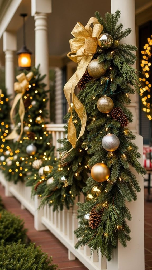 Attach large gold bows around the columns at eye level for visual balance. Combine with greenery wraps, small hanging ornaments, or lights to create a layered, luxurious look. Ensure bows are securely fastened to prevent damage from wind or rain. Vary bow sizes for added visual interest and elegance. This simple yet impactful decoration draws attention to architectural features and adds a festive focal point. Gold bows bring a celebratory feel, instantly enhancing the porch aesthetic while complementing other gold accents throughout the display.