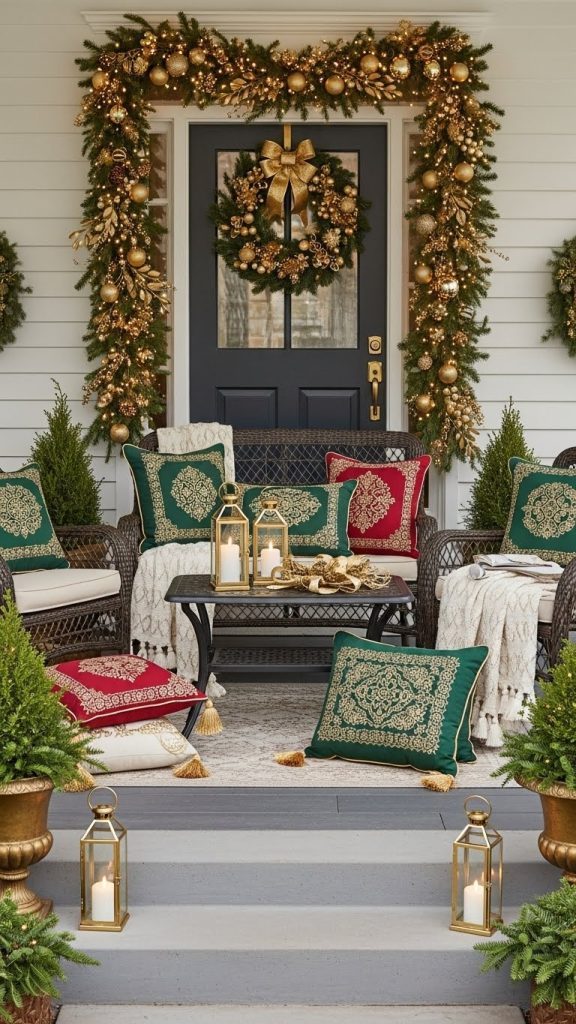 Arrange pillows on chairs, benches, or swings for visual interest and cozy appeal. Incorporate gold tones in patterns like stripes, stars, or snowflakes. Complement with soft throws for warmth and texture. Ensure cushions are suitable for outdoor conditions and can be stored in case of rain. Gold accents on seating provide both functional comfort and aesthetic enhancement, making your porch inviting while reinforcing the festive theme. Coordinating pillows with other gold elements ties the entire porch decor together seamlessly.