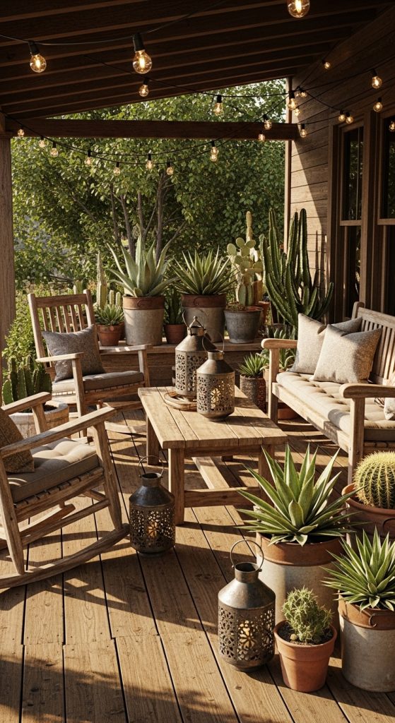 Add simple planters with desert plants or grasses to enhance the western atmosphere. String lights can create a warm evening glow.
