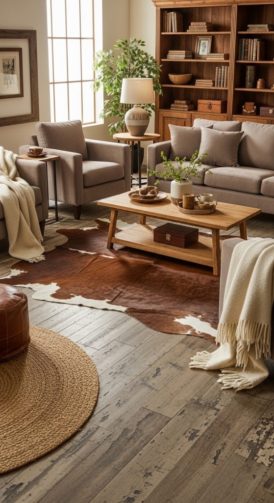 Avoid cluttering the space with too many patterned fabrics. Let the cowhide stand out as a statement piece. Natural textures help create a warm and grounded environment that reflects western simplicity and rugged beauty.