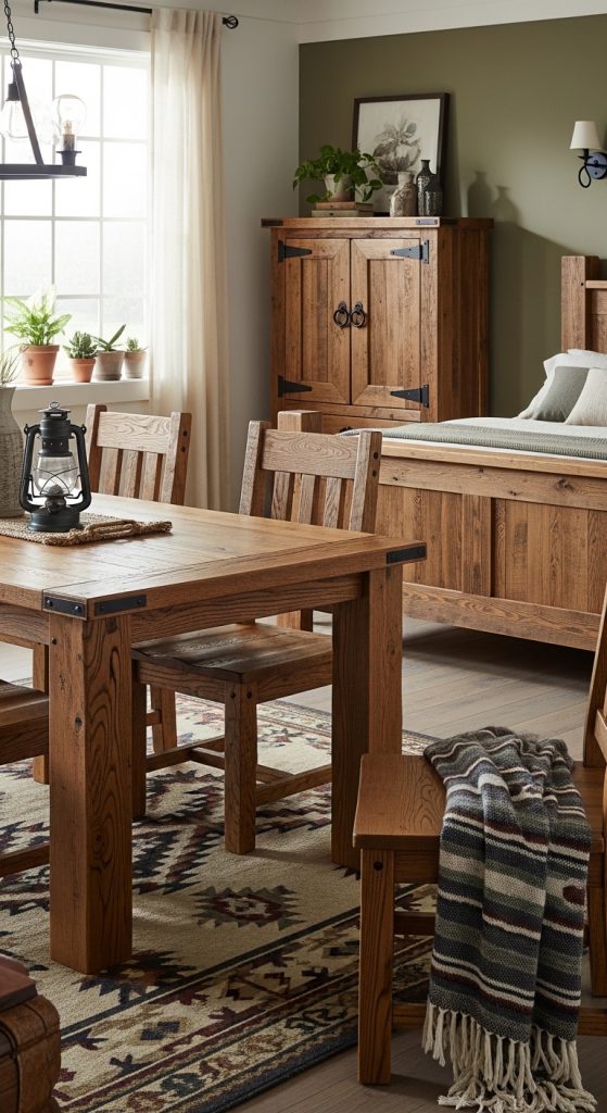 To balance the heaviness of wood, combine it with lighter fabrics or neutral walls. This prevents the room from feeling too dark. Proper placement and spacing will ensure your furniture looks strong and grounded while still allowing easy movement within the room. Rustic wooden furniture sets the tone for a true cowboy interior.