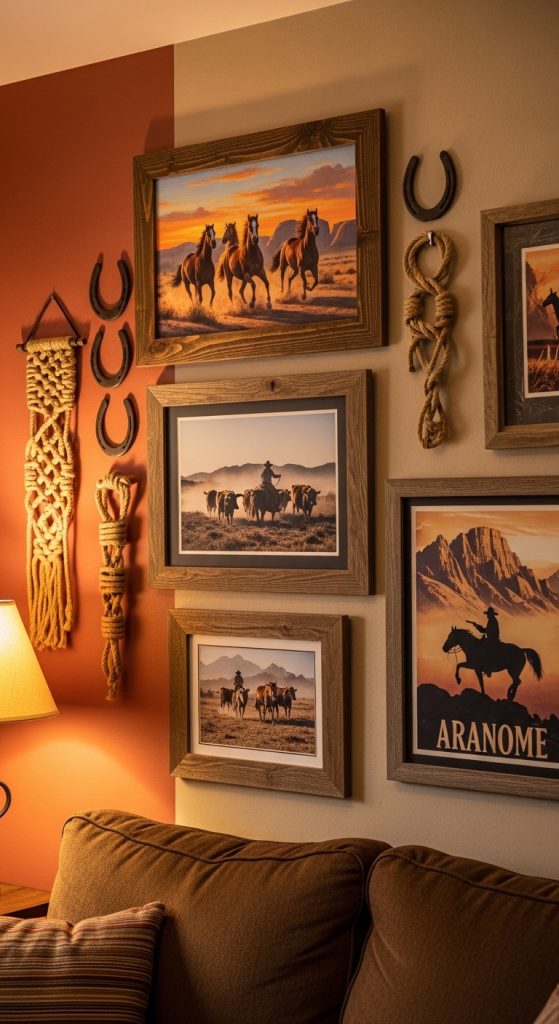 Materials such as wooden frames, metal accents, and vintage style posters enhance the western aesthetic. You can also include decorative items like horseshoes, rope art, or metal stars. Mount these securely using proper wall anchors to prevent damage.