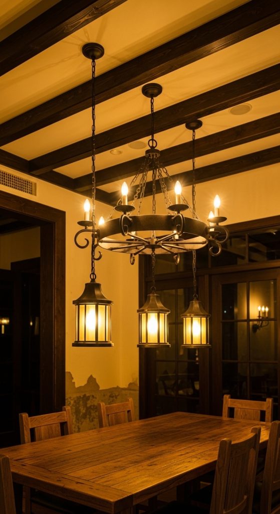 Lighting is essential in creating the right atmosphere. Choose fixtures made from wrought iron, aged metal, or wood. Chandeliers with a rustic design or lantern style pendant lights work well in dining areas and entryways. Preparation includes planning the electrical layout and ensuring safe installation.