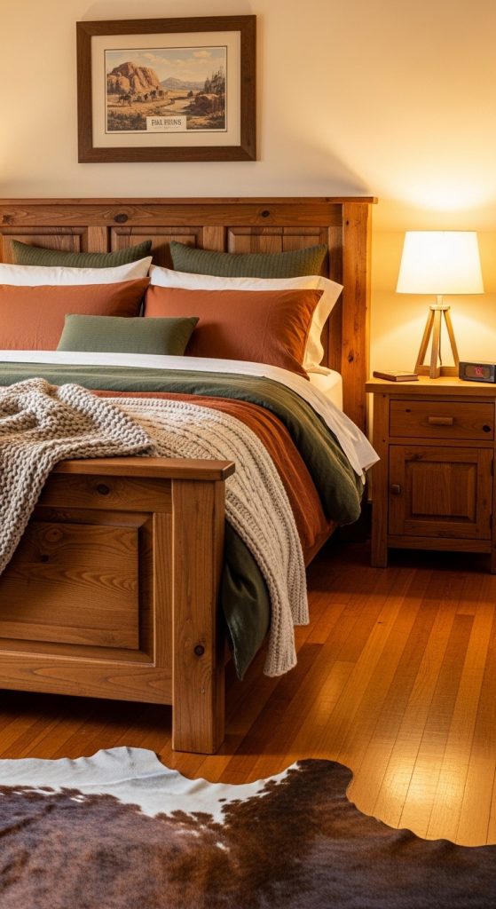 Add throw blankets with simple western patterns. Use bedside tables made from wood or metal. Soft lighting and neutral curtains create a calm environment.