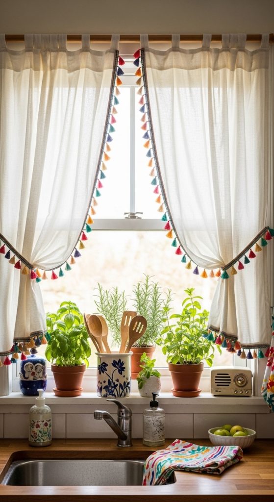 Tassel trim curtains are easy to make and add playful boho flair above your kitchen window.