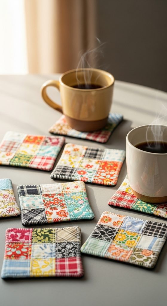 If you have leftover fabric scraps from old clothing, curtains, or sewing projects, fabric scrap coasters are a practical and beautiful way to repurpose them. Begin by cutting the fabric into equal sized squares or circles. You can choose coordinated colors for a uniform set or mix fabrics for a patchwork effect. To add stability, use layers by placing two or three pieces together. Sew around the edges using a simple straight or zigzag stitch. For those who prefer a no sew method, use fabric glue to secure the layers. If the fabric frays easily, fold over the edges to create a clean border. These coasters are lightweight, washable, and durable. They protect surfaces from heat and water while adding a handcrafted touch to your living room or dining area. You can also create themed coaster sets like muted neutrals, floral prints, or geometric patterns. Fabric scrap coasters make excellent handmade gifts as well. This project demonstrates the value of repurposing textiles rather than discarding them, contributing to reduced fabric waste.