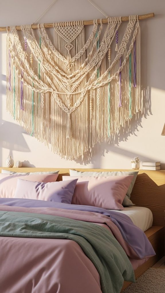 Tip: Add beads or small pastel threads to personalize. Hang above the bed or desk for a delicate focal point. Macrameโs soft texture adds warmth and artistic flair to the room.