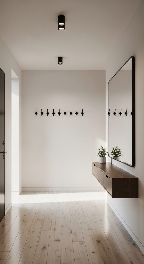 Add a slim console table made from wood or metal. A wall-mounted shoe cabinet saves space and keeps the area tidy. Install simple wall hooks for coats and bags. Lighting is important in minimalist design. Use recessed ceiling lights or a simple pendant lamp.