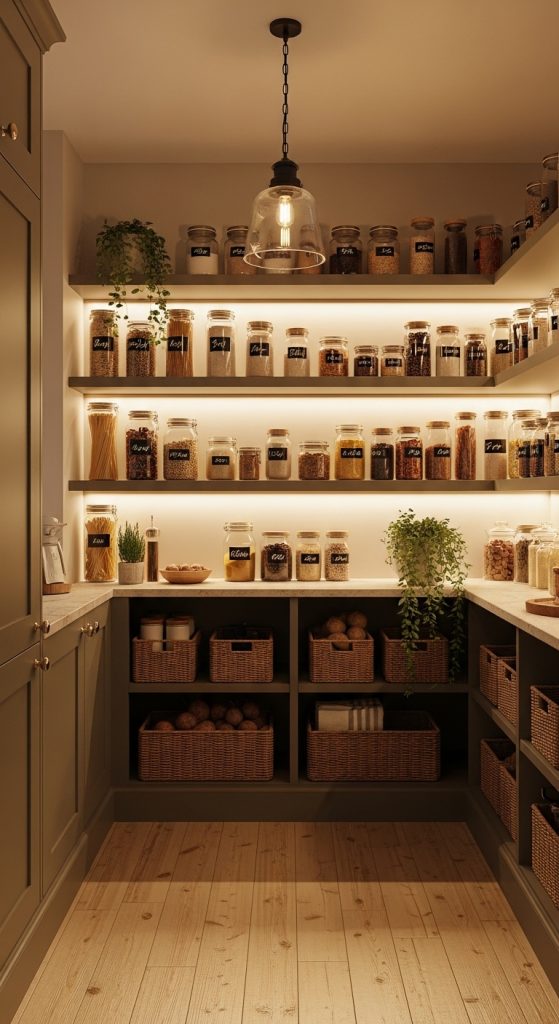 Materials such as wood or MDF work well for painted pantry doors or shelving. Matte or satin finishes are recommended for ease of cleaning. Pairing olive green storage with neutral wall colors or metallic handles adds contrast and sophistication. Additionally, including baskets, jars, and containers in complementary tones enhances organization and visual appeal. Olive green storage spaces allow you to bring color into the kitchen without overwhelming the main areas, providing both functionality and style.