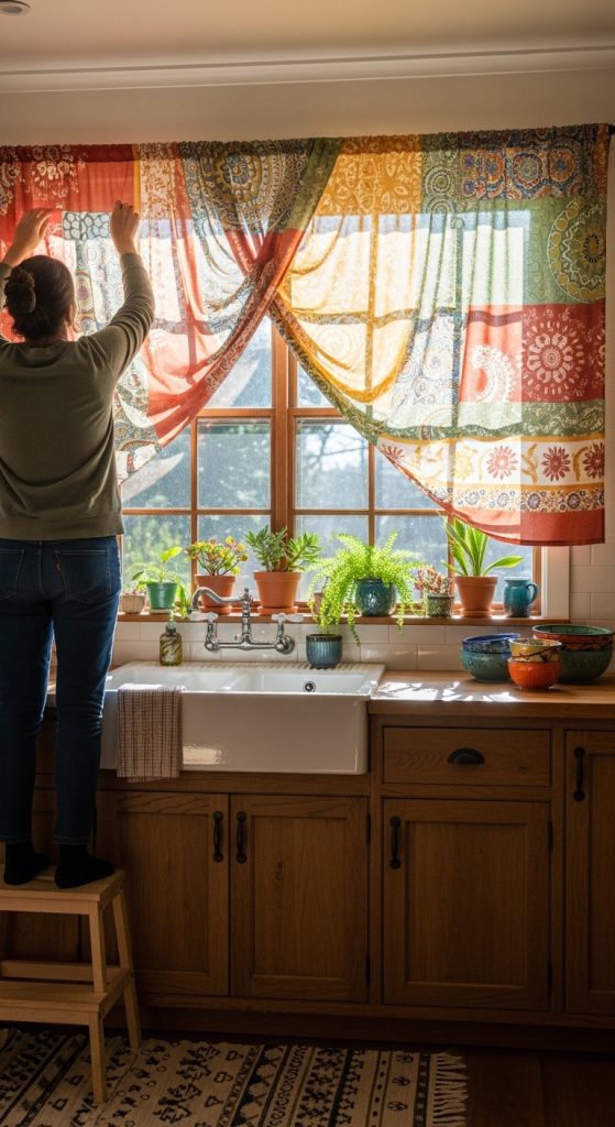 Once your fabric is prepared and your rod is installed, it is time to hang your curtains. Slide the fabric into the rod pocket or attach it to rings or hooks, depending on your curtain style. Adjust the gathers evenly across the window for a balanced appearance. For cafรฉ curtains, ensure the bottom edge aligns neatly with the windowsill. Check that the curtains open and close smoothly and that the fabric does not obstruct faucet handles or sink space. Boho curtains often benefit from slightly uneven or relaxed draping, which adds to their charm. If you are using tiebacks, position them at a comfortable height to hold the curtains open without interfering with kitchen activities. Taking the time to hang curtains carefully ensures they look intentional, functional, and enhance the cozy, eclectic style of your kitchen.