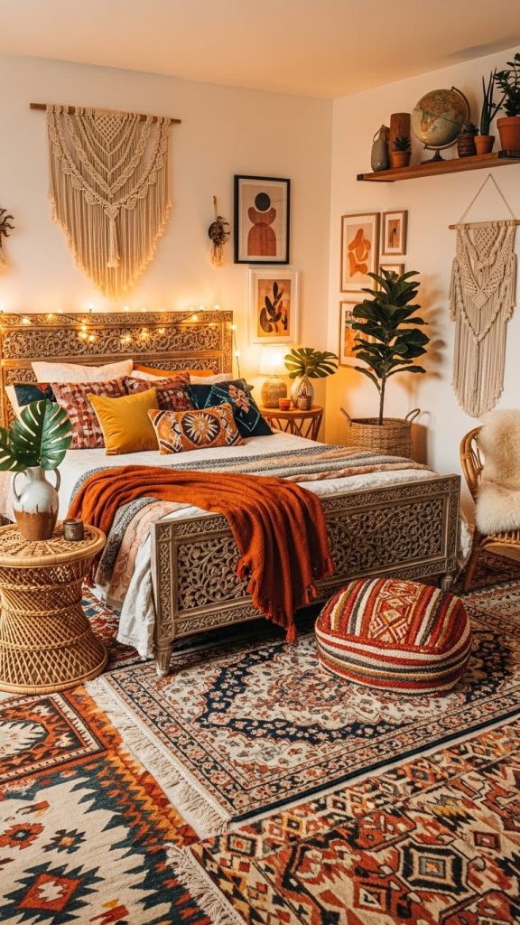 Bohemian bedrooms are ideal for couples who enjoy a relaxed, eclectic, and artistic atmosphere. Layered textures, vibrant patterns, and natural elements define this style. Begin by selecting a central piece, such as a carved wooden bed frame or a colorful upholstered headboard. Incorporate ethnic textiles like rugs, cushions, and throws to introduce warmth and personality.