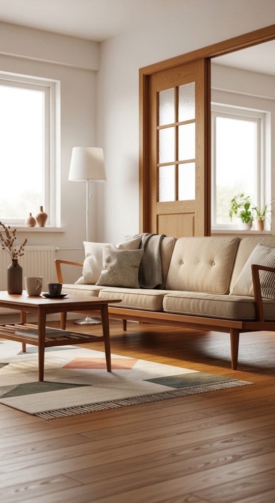 Materials for accent pieces may include cotton, wool, or velvet fabrics. Ceramic vases and abstract art prints also work well in these colors. The key is balance. The room should feel lively but not overwhelming. The contrast between neutral walls and warm, earthy accents gives your apartment the classic MCM charm.