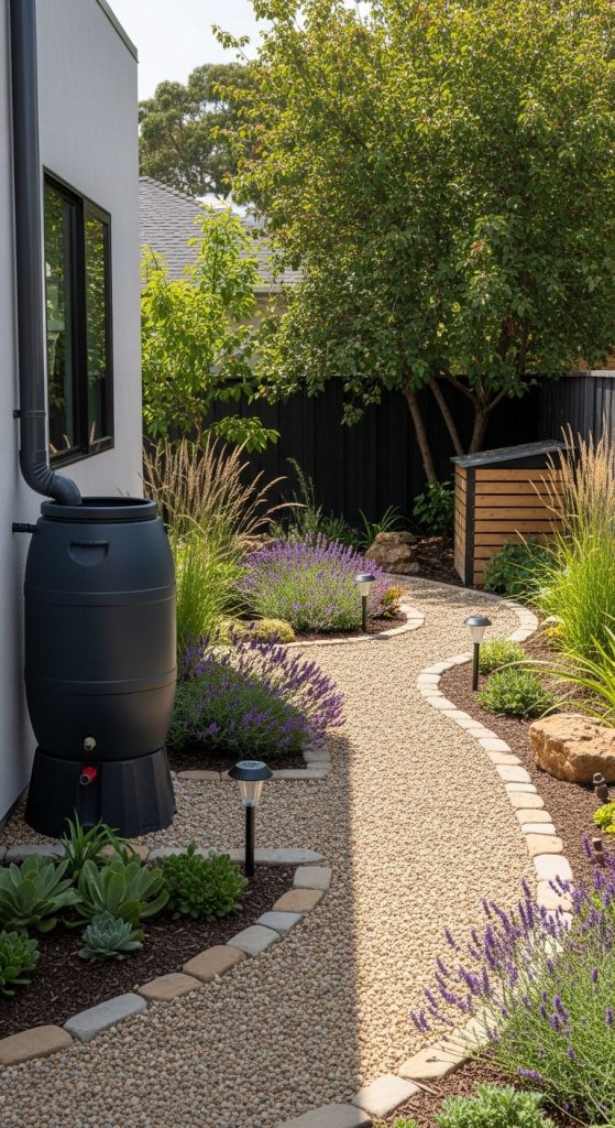 Start by choosing drought-resistant plants and native species that require minimal watering and care. Incorporate permeable paving materials to allow rainwater absorption and prevent runoff. Composting, rainwater harvesting, and smart irrigation systems can further reduce resource use. Mulching garden beds helps retain moisture and improves soil health. Additionally, use recycled or sustainable materials for hardscaping and furniture, such as reclaimed wood, recycled metal, or eco-friendly composites.
