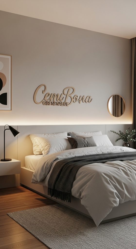 Personalized wall signs make the bedroom feel more intimate and expressive, turning the space above the bed into a meaningful decorative feature.