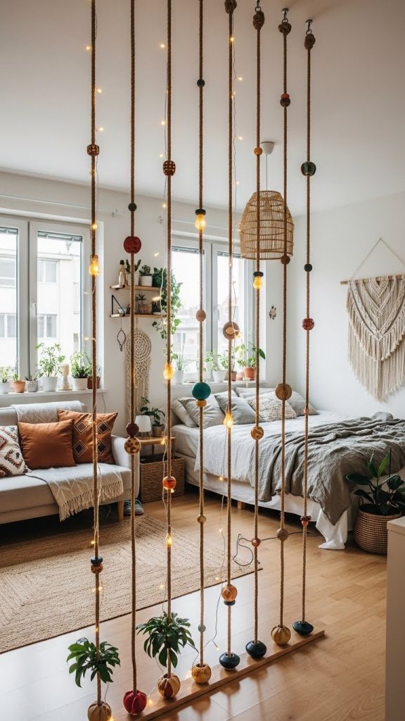 Rope or string dividers are a creative and budget-friendly option for studio apartments. This type of divider uses vertical or horizontal ropes, strings, or cords to create a semi-transparent separation. They are lightweight, flexible, and easy to install. Rope dividers can be customized with beads, lights, or decorative knots to add personality to the apartment. They are perfect for creating a visual boundary without blocking light or airflow. This option works well for casual and bohemian-style interiors. Rope dividers can also double as a backdrop for decorative items or hanging organizers. They are an easy, stylish way to define zones in small spaces.
