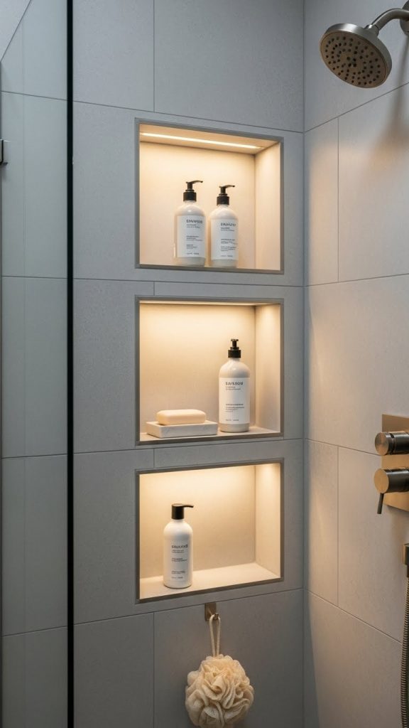 Recessed shelves are built into the wall, creating a streamlined look and saving space. They are particularly useful in showers or near bathtubs to hold shampoo, soap, and other bath products. Recessed shelves reduce clutter and provide easy access to items without protruding into the room. They can be tiled to match the bathroom walls for a seamless appearance. Waterproofing is essential when installing recessed shelves in wet areas to prevent moisture damage. Recessed shelves come in single or multiple tiers and can be combined with decorative tiles or lighting for a stylish effect. These shelves are a permanent solution that adds both functionality and sophistication to a bathroom. Their discreet design makes them perfect for small spaces, creating storage without compromising the flow of the room.