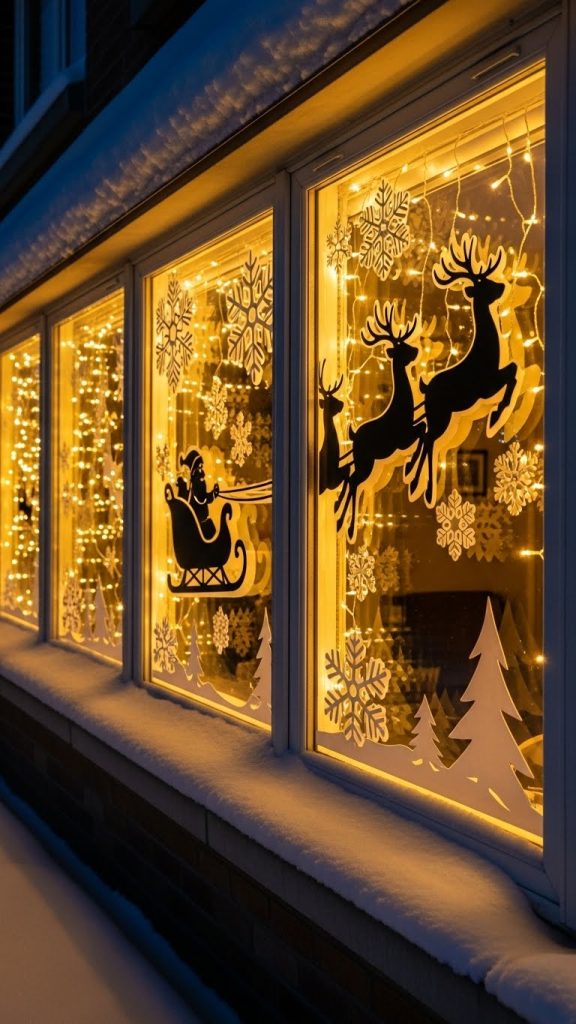 Window silhouettes or decals allow you to extend Christmas decor indoors while making it visible from outside. Materials include adhesive vinyl decals, silhouette cutouts, LED window lights, or light projectors.