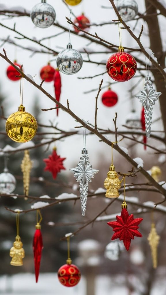 Hanging ornaments from outdoor trees adds depth and visual interest without requiring extensive setup. Materials include durable outdoor ornaments, string or fishing line, and hooks or clips.