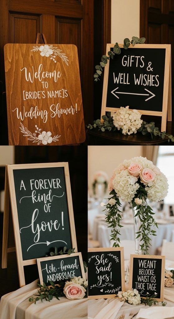 Customized signage is a practical and decorative element that guides guests, highlights areas, and adds a personal touch. Signs can welcome guests, indicate gift or food tables, or display quotes and messages for the couple. Preparation involves selecting materials such as wood, acrylic, chalkboards, or cardstock, and deciding on fonts, colors, and designs. Tools like markers, paint, vinyl letters, or printers can be used to create signs. Position signs in visible areas, such as the entrance, buffet, or photo booth, ensuring they complement other decorations. Personalized signs can also include the coupleโ€™s names, wedding dates, or fun facts about them to create a more intimate atmosphere. For a cohesive look, coordinate sign styles with invitations, napkins, and other printed items. Setting up signs a day in advance helps identify any missing pieces or adjustments needed. Well-made signage not only helps guests navigate the event but also contributes to the overall aesthetic, making the wedding shower feel polished, thoughtful, and celebratory.