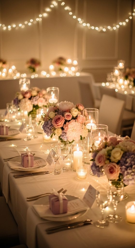 Candles and fairy lights are versatile decorations that create warmth, softness, and romantic ambiance. They can be used on tables, shelves, or to outline pathways. Preparation requires choosing appropriate lighting, including LED candles for safety, candle holders, or string lights, depending on the desired effect. Place candles in groups of different sizes or pair them with floral arrangements to enhance tablescapes. Fairy lights can be draped along walls, ceilings, or furniture for a twinkling effect. For outdoor events, weatherproof lights or lanterns are recommended. Lighting should be soft and balanced to avoid harsh shadows or glare in photos. Ensure candles are placed safely away from flammable materials and that supervision is available if using real flames. Incorporating lighting strategically can transform the space from plain to enchanting. Well-planned candle and fairy light arrangements add a cozy and magical touch that enhances guest experience and complements other wedding shower decorations.