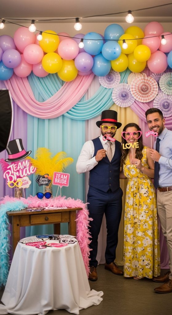 Photo booth backdrops are a fun and interactive decoration that allows guests to take memorable pictures. These backdrops can match the wedding shower theme and can include balloons, flowers, fabric drapes, paper fans, or customized banners. Preparing a photo booth requires a designated area, backdrop materials, stands or hooks, and props such as hats, glasses, or signs. Choose a backdrop size that fits the space and accommodates multiple people. Secure materials to the stand or wall, ensuring it is stable and safe. Adding lights, like string lights or soft LED lamps, enhances photo quality and ambiance. Consider providing a small table for props and a sign explaining how guests can take photos or tag them on social media. Photo booth backdrops offer entertainment and create lasting memories for guests. They also double as decorations, filling empty walls with visual interest. It is important to plan setup time and ensure the backdrop matches other elements of the dรฉcor to maintain a cohesive and stylish event aesthetic.