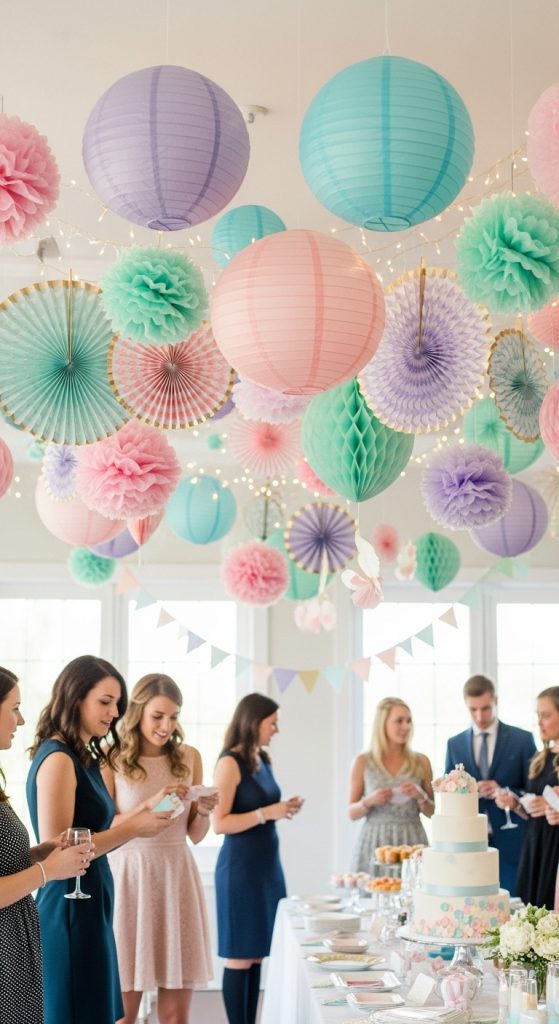 Hanging paper decorations, such as paper lanterns, pom-poms, or fans, add movement, texture, and color to a wedding shower space. These decorations are lightweight, easy to transport, and cost-effective, making them perfect for DIY setups. Preparation requires paper decorations, string or ribbon, scissors, and hooks or adhesive for hanging. Select colors that complement the wedding shower theme and mix sizes for visual interest. Attach strings to the decorations and hang them from ceilings, walls, or arches, ensuring they are secure and at different heights to create dimension. Paper decorations can also be paired with greenery or fairy lights to enhance their appeal. For outdoor events, choose weather-resistant materials or set up the decorations in sheltered areas. Hanging decorations draw attention upward, making the room feel taller and more festive. They are versatile enough to suit various themes, from elegant and romantic to playful and colorful. Planning their placement carefully ensures that they do not interfere with guestsโ€™ movement or seating arrangements.