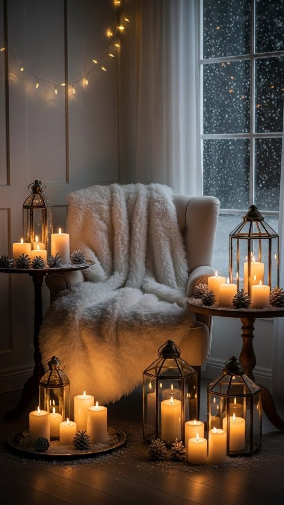 Lighting plays a major role in making a winter party feel warm despite the cool color palette. A white candlelight glow corner focuses on creating an intimate nook filled with candles, lanterns, and white accessories. You will need pillar candles, taper candles, hurricane lanterns, candle trays, and optional white faux fur throws. Choose an empty corner of the room and place a low table or stack of white crates to elevate some elements. Arrange candles in varying heights to provide multiple layers of soft illumination. Lanterns with glass sides enhance the glow and add a traditional winter feel. You can place white pinecones, small white ornaments, or frosted branches around the candles to create texture. If your party venue does not allow open flames, use high quality LED candles that flicker realistically. This decor idea works especially well for evening events, creating a cozy refuge from the rest of the room. It adds warmth and visual interest without relying on color. Candlelight corners complement white winter themes beautifully because they provide glow without overpowering the minimalistic palette. This design also doubles as a lovely backdrop for photos or quiet conversations.
